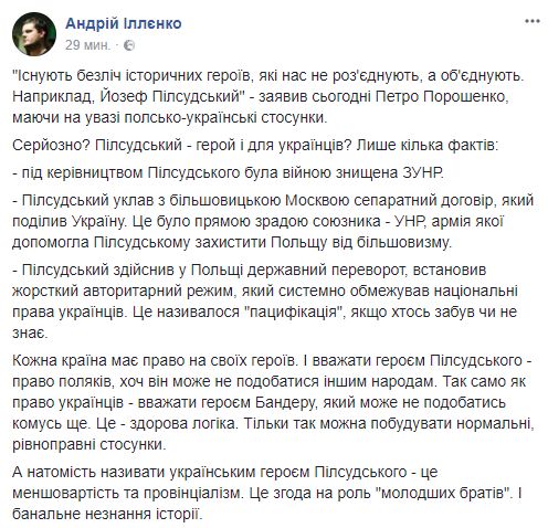 Но называть украинским героем Пилсудского - это неполноценность и провинциализм. Это согласие на роль "младших братьев". И банальное незнание истории".