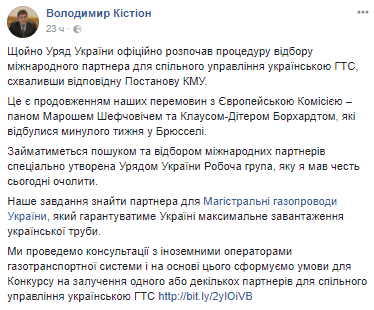 По его словам, это решение принято по итогам недавней встречи представителей правительства Украины и Европейской комиссии. "Это является продолжением наших переговоров с Европейской Комиссией - вице-президентом Еврокомиссии Марошем Шефчовичем и Клаусом-Дитером Борхардтом (директор отдела по внутреннему рынку ЕС генерального директората по энергетике ЕК), состоявшихся на прошлой неделе в Брюсселе. Заниматься поиском и отбором международных партнеров будет специально созданная правительством Украины рабочая группа, которую я имел честь сегодня возглавить. Наша задача найти партнера для "Магистральных газопроводов Украины", который будет гарантировать максимальную загрузку украинской трубы. Мы проведем консультации с иностранными операторами газотранспортной системы и на основе этого сформируем условия для конкурса на привлечение одного или нескольких партнеров для совместного управления украинской ГТС", - написал Кистион на своей странице в Facebook.