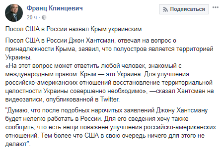 Первый заместитель председателя комитета СФ по обороне Франц Клинцевич написал в Facebook, что Хантсману будет нелегко работать в России.