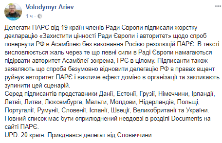"В тексте выражается сожаление из-за того что определенные силы в Совете Европы пытаются подорвать авторитет Ассамблеи числе и СЕ в целом. Подписанты также заявляют, что попытка безусловно восстановить делегацию РФ в правах полностью разрушает авторитет ПАСЕ и вызовет эффект домино в организации и призывают остановить этот сценарий", - написал Арьев.