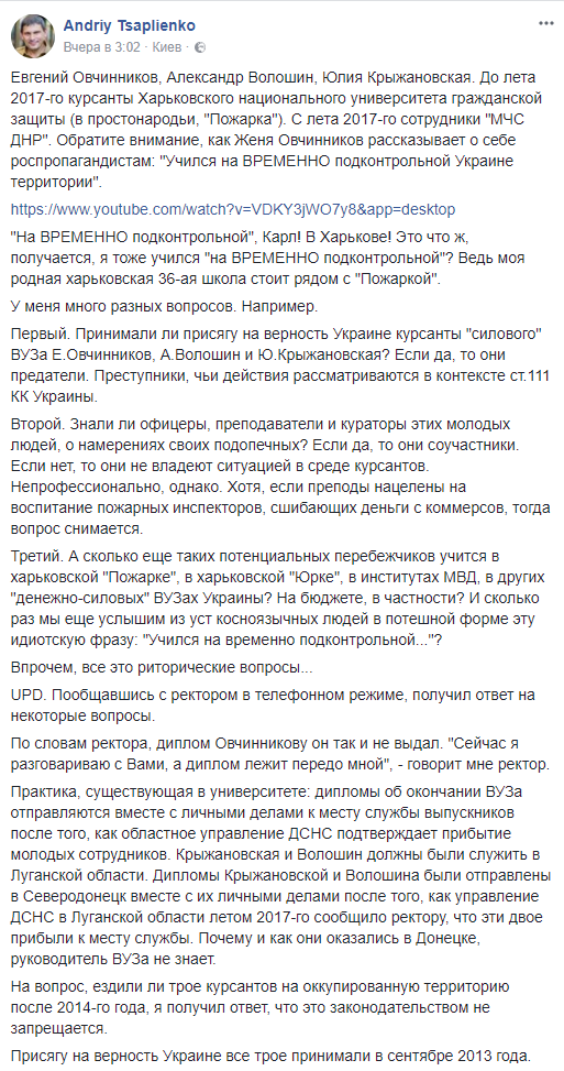 "А сколько еще таких потенциальных перебежчиков учится в харьковской "Пожарке", в харьковской "Юрке", в институтах МВД, в других "денежно-силовых" ВУЗах Украины? На бюджете, в частности? И сколько раз мы еще услышим из уст косноязычных людей в потешной форме эту идиотскую фразу: "Учился на временно подконтрольной..."? Впрочем, все это риторические вопросы..." - добавляет Цаплиенко.