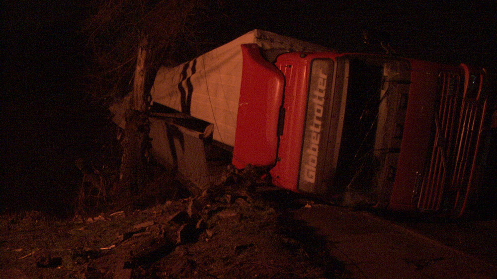 Грузовой автомобиль Volvo перевозил катушки с кабелями весом примерно 2 тонны каждая, когда врезался в железобетонные элементы моста над железнодорожными путями и перевернулся.