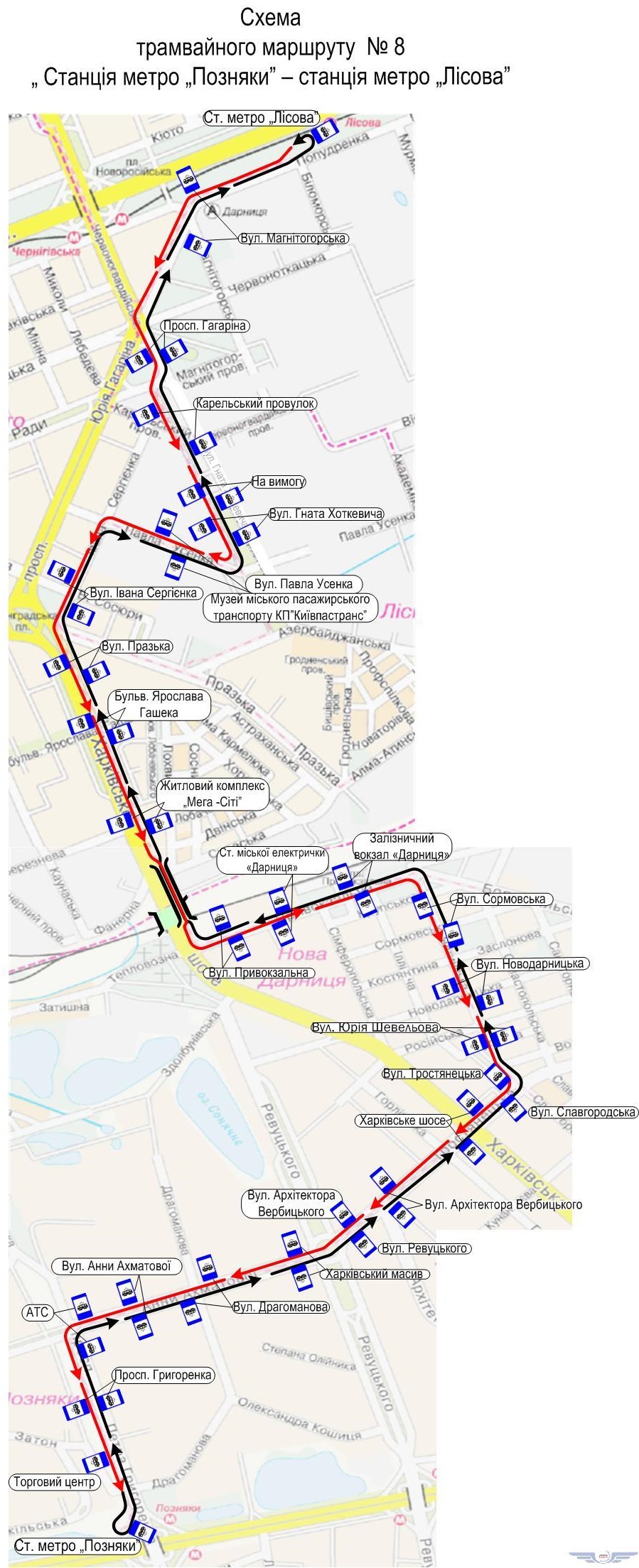С 14:10 пятницы 15 декабря в Киеве из-за прорыва трубы было заблокировано движение трамвайного маршрута № 8 на ул. Тростянецкая, 28-А в направлении станции метро "Позняки". Из-за этого трамваи маршрута № 8 временно будут курсировать по маршруту № 29.