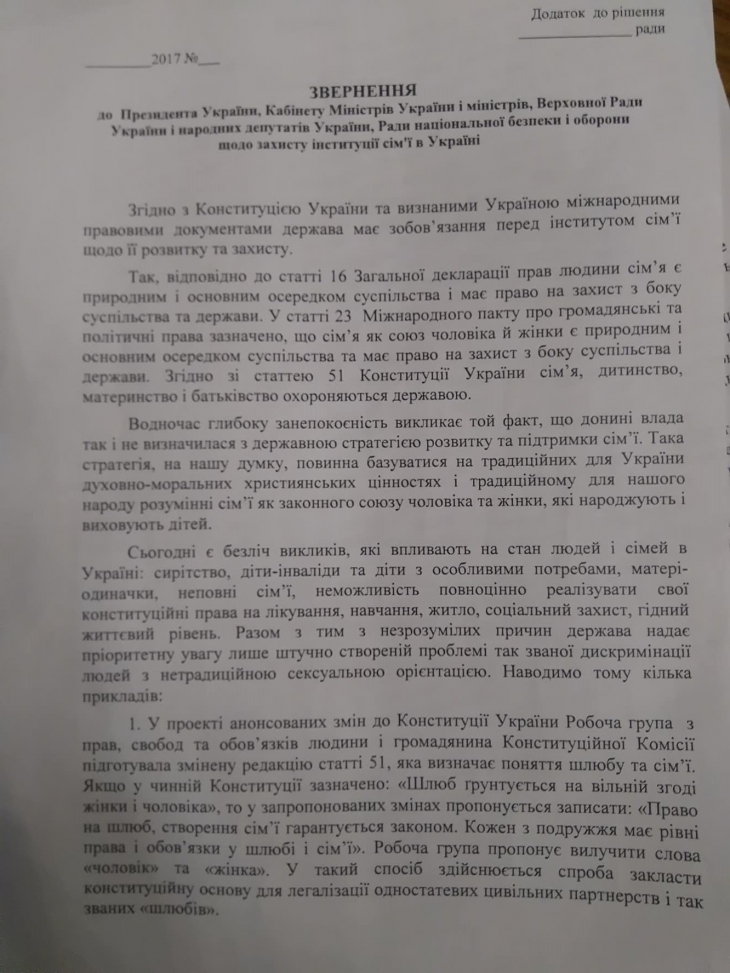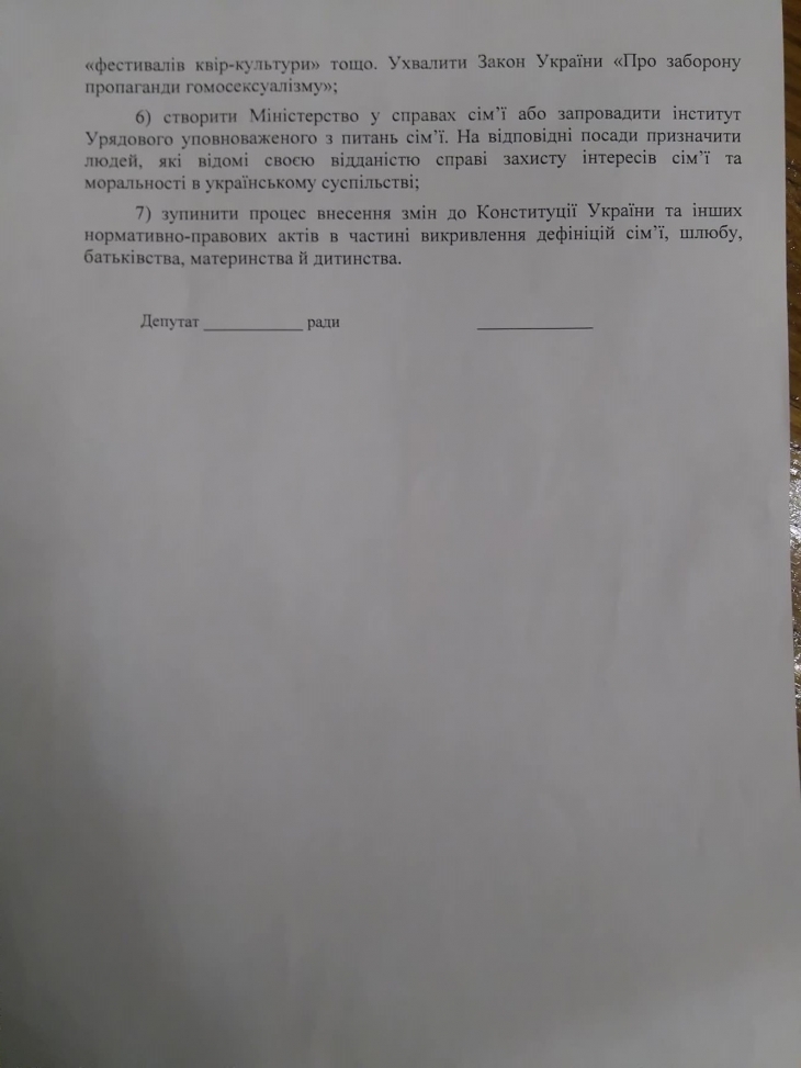 В обращении предлагается запретить все марши и акции ЛГБТ, а также "исключить словосочетания "сексуальная ориентация" и "гендерная идентичность" из Кодекса законов о труде Украины и из других законов, законопроектов и правительственных документов как несущие исключительно идеологическую и антинаучную нагрузку".