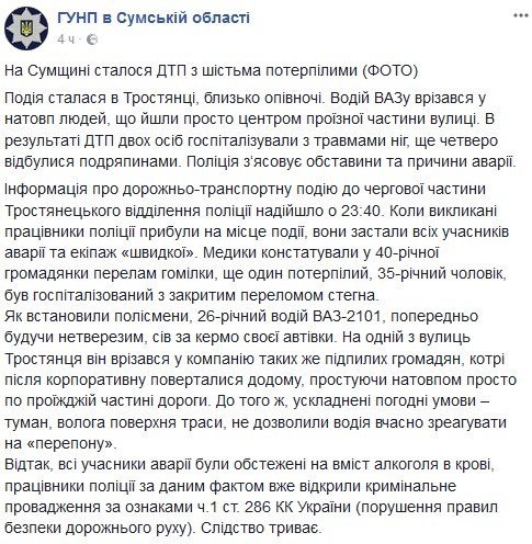Как установили полицейские, 26-летний водитель ВАЗ-2101, предварительно будучи нетрезвым, сел за руль своего автомобиля. На одной из улиц Тростянца он врезался в компанию таких же подвыпивших граждан, которые после корпоратива возвращались домой, идя толпой просто по проезжей части дороги. К тому же, осложненные погодные условия - туман, влажная поверхность трассы, не позволили водителю вовремя среагировать на "преграду".