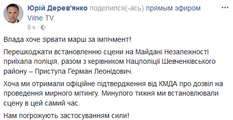 Деревянко отметил, что организаторы получили официальное подтверждение от КГГА о разрешении на проведение мирного митинга. При этом Деревянко заявил, полиция угрожала активистам применением силы.