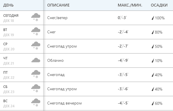 Сайт Gismeteо обещает осадки в виде мокрого снега всю неделю. Днем -1...-2. С четверга по субботу ресурс обещает морозный пик: -4...-6 днем. Ночью -2...-9. С 21 на 22 декабря до -12 в темное время суток.