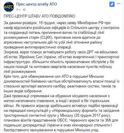 "По данным разведки, 19 декабря, из-за заявления Минобороны РФ о намерении отозвать российских офицеров из Совместного центра по контролю и координации вопросов прекращения огня и стабилизации линии разграничения сторон (СЦКК), противник может прибегнуть к агрессивным наступательным действиям по всей линии соприкосновения района проведения антитеррористической операции", - говорится в сообщении.