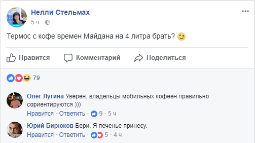 "На кофе и общение с друзьями ждем киевлян, гостей города и отдельно героев нашего времени, настоящих участников войны с восточным соседом! С собой иметь хорошее настроение, кофе в термосах, бутерброды и конфеты Рошен! Цель - показать обществу несколько иную картинку, чем еженедельные политические вакханалии и попытка штурма Октябрьского дворца!", - говорится в описании мероприятия в соцсети.