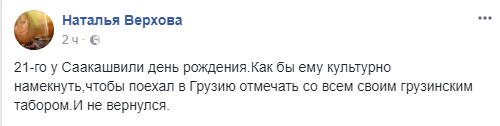И Наталья Верхова: "21-го у Саакашвили день рождения. Как бы ему культурно намекнуть,чтобы поехал в Грузию отмечать со всем своим грузинским табором. И не вернулся".