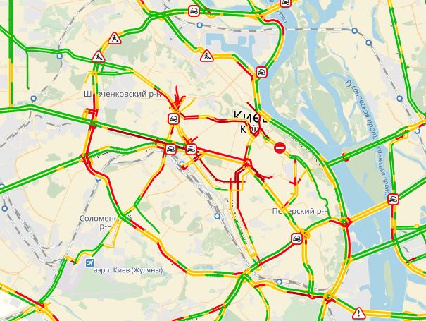Кроме того, улица Гетьмана возле Шулявского моста полностью парализована в обе стороны (скорость движения до 7 км/ч.).