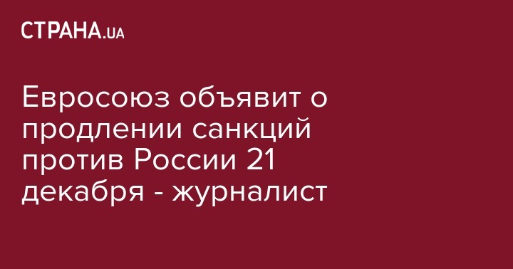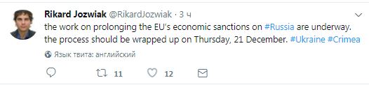 "Продолжается работа над продолжением экономических санкций ЕС в отношении России. Этот процесс должен быть завершен в четверг, 21 декабря", - написал журналист.