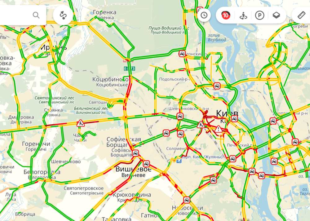 На подъездах к городу пробки есть на Житомирском шоссе и на Соборной Киевской. На остальных трассах тоже встречаются тянучки, но в целом движение более менее нормальное.