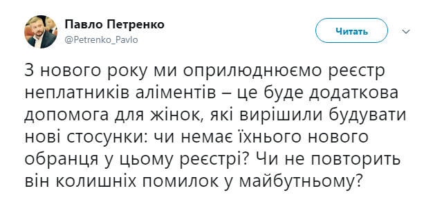 С 2018 года в Украине появится публичный реестр неплательщиков алиментов. Об этом сообщил министр юстиции Павел Петренко в Twitter.