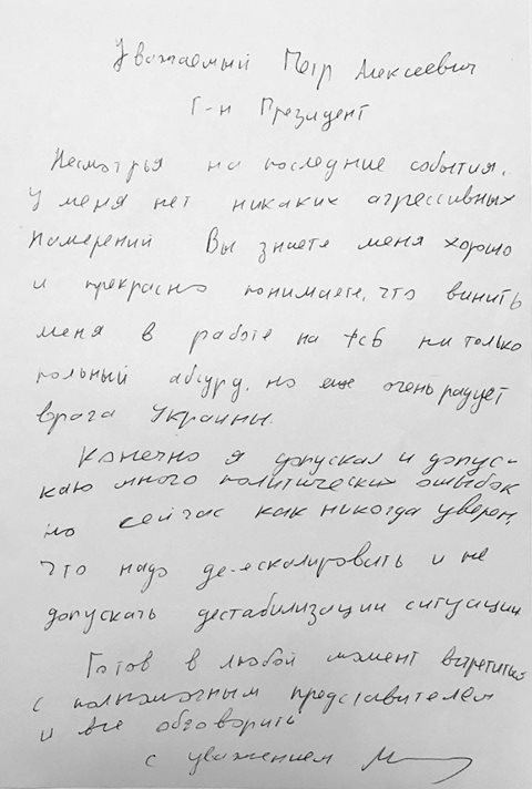В письме лидер "Руху новых сил" называет "абсурдом" обвинения в связях с ФСБ и говорит, что у него нет "никаких агрессивных намерений".