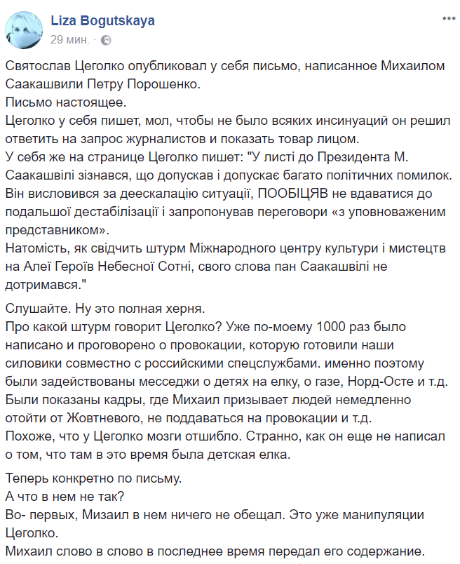 "А письмо таки Саакашвили написал Порошенко. И вспомнил о своих политических ошибках. Очень странный текст, очень", - вторит Уколову журналист Сергей Руденко.