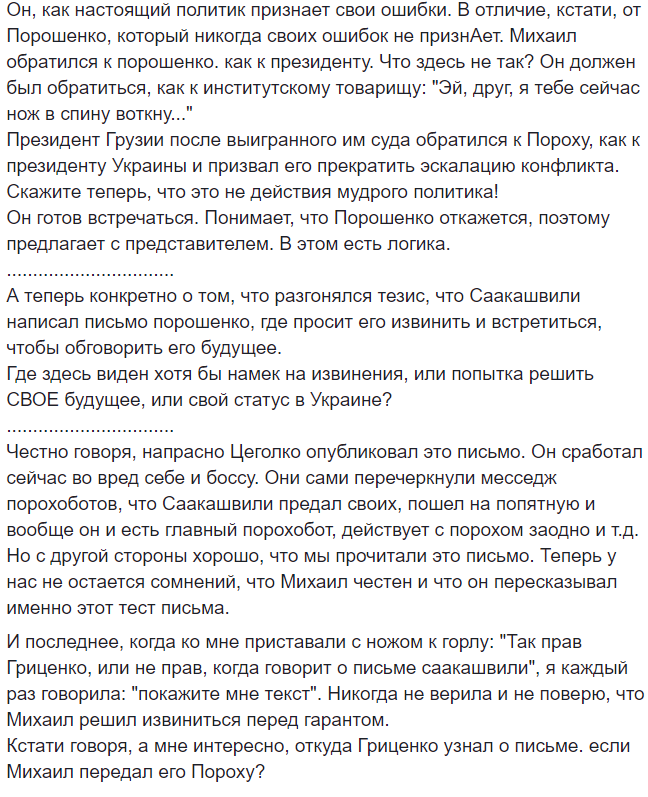 "Михаил слово в слово в последнее время передал его содержание. Он, как настоящий политик признает свои ошибки. В отличие, кстати, от Порошенко, который никогда своих ошибок не признАет. Михаил обратился к порошенко. как к президенту. Что здесь не так? Он должен был обратиться, как к институтскому товарищу: "Эй, друг, я тебе сейчас нож в спину воткну...".