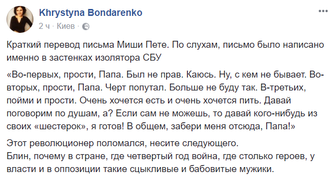 Журналистка Кристина Бондаренко представила свой "краткий перевод письма Миши Пете".
