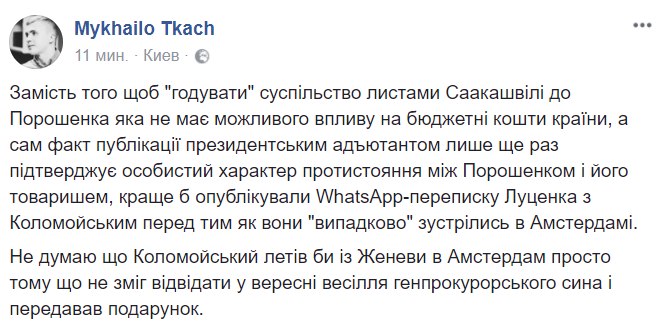 "Сам факт публикации президентским адъютантом только еще раз подтверждает личный характер противостояния между Порошенко и его товарищем, лучше бы опубликовали WhatsApp-переписку Луценко с Коломойским перед тем как они "случайно" встретились в Амстердаме".
