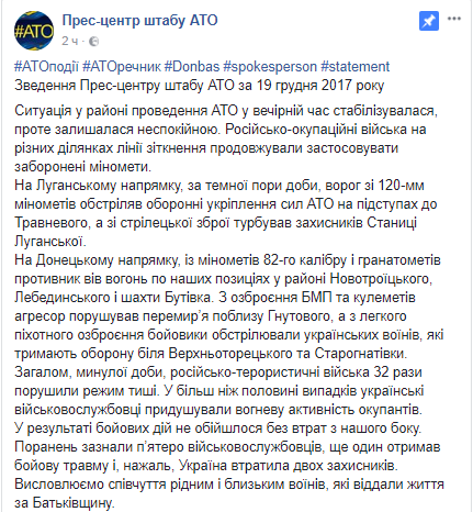 За сутки, 19 декабря, в зоне АТО на Донбассе погибли двое украинских военных и ранены еще пять.