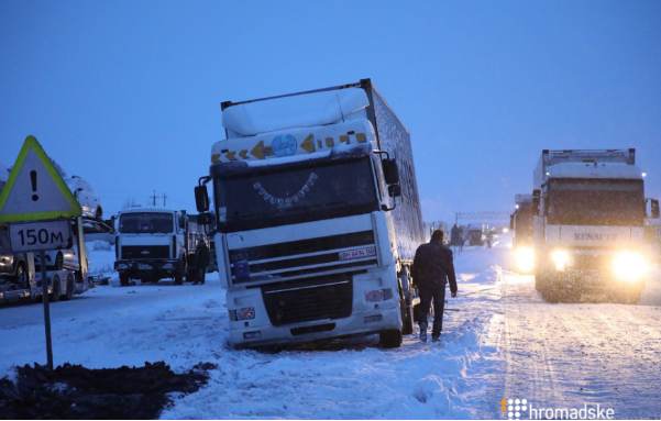 К 7 утра на участке дороги Киев-Одесса, на границе Киевской и Черкасской областей, между Белой Церковью и Жашковом, образовалась пробка, вызванная скользкой дорогой и застрявшими в снегу фурами.