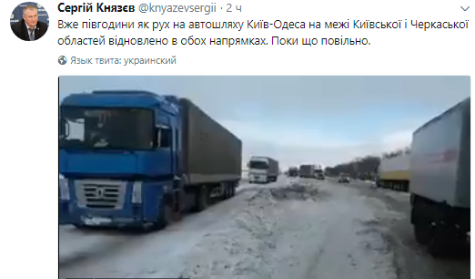 К обеду пробка увеличилась до 18,5 км. К спасению фур из снежного плена на границе Киевской и Черкасской области подключилась полиция. На место отправились главв Нацполиции Сергей Князева и глава ГосЧС Николай Чечеткин.