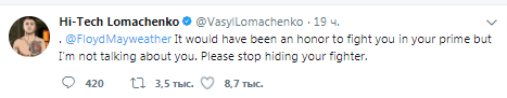 "Это было бы честью сразиться с тобой, когда ты был на пике, но я сейчас я говорю не о тебе. Пожалуйста, хватит прятать от меня своего бойца", - написал Василий Ломаченко.