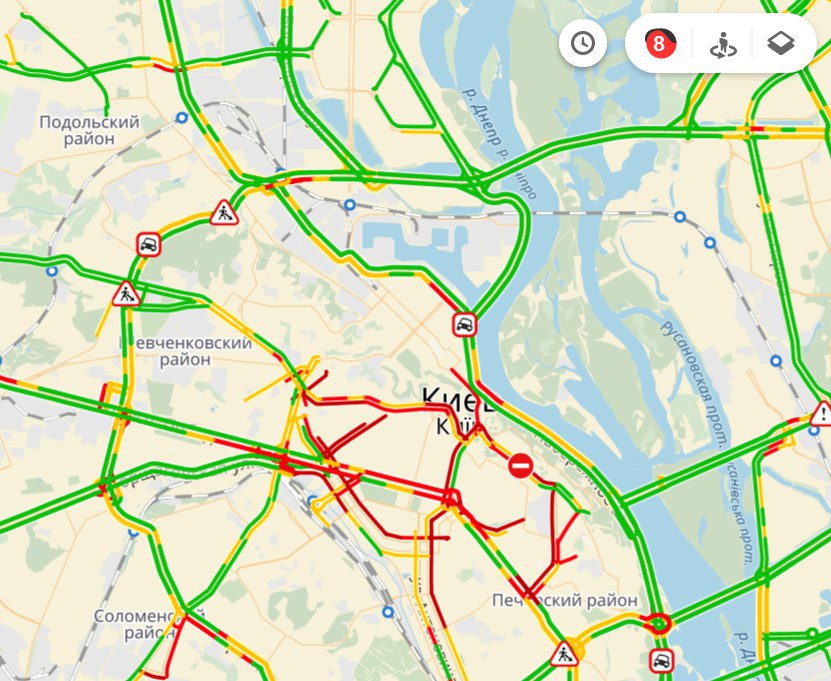 В Киеве по состоянию на 15.45 среды, 20 декабря пробки уже вышли из-под контроля и составляют 8 баллов. Стоит или едет со скоростью 3-5 км\ч центре города - улицы Крещатик, Ярославов вал, Прорезная, Богдана Хмельницкого, бульвар Тараса Шевченко.