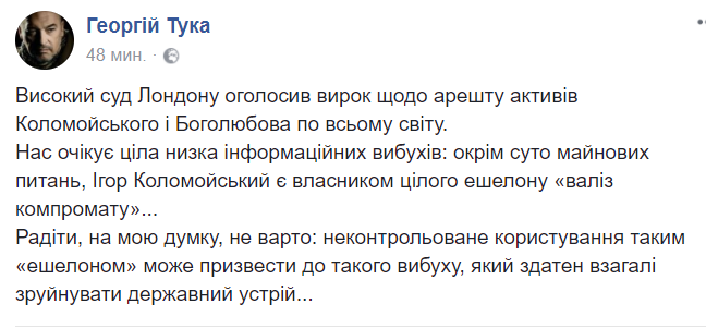 "Если стратегически - то пиз@ц котёнку. Сейчас активы арестованы как мера обеспечения иска. То есть распоряжаться ими Коломойский не сможет. Но управлять ими Приватбанк будет в состоянии только в случае удовлетворения иска судом. Но уже сейчас начнутся для Коломойского проблемы с личными счетами и кредитками. Что касается 1+1, то тут будет история как с НТВ. Когда после прихода к власти Путина к НТВ предъявил претензии по кредитам Газпромбанк. И вскоре телекомпания перешла под его контроль. А значит и под контроль государства".