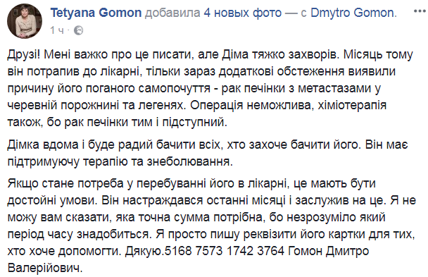 "Друзья! Мне трудно об этом писать, но Дима тяжело заболел. Месяц назад он попал в больницу, только сейчас дополнительные обследования обнаружили причину его плохого самочувствия - рак печени с метастазами в брюшной полости и легких. Операция невозможна, химиотерапия также, потому что рак печени тем и коварен.