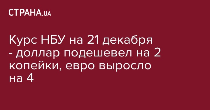 В четверг, 21 декабря, Нацбанк установил официальный курс гривны по отношению к иностранным валютам. По сравнению с 20 декабря доллар немного подешевел, а евро стало дороже. Об этом сообщается на сайте НБУ.
