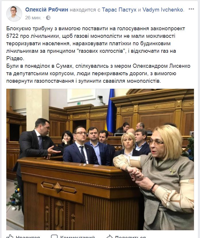 "Блокируем трибуну с требованием поставить на голосование законопроект 5722 о счетчиках, чтобы газовые монополисты не имели возможности терроризировать население, начислять платежки по домовым счетчикам по принципу "газовых колхозов", и отключать газ на Рождество", - написал Рябчин.
