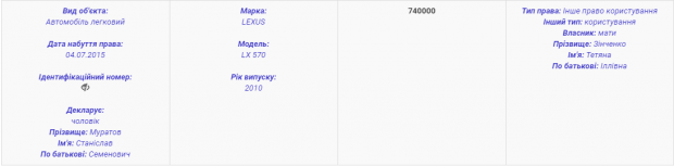 Отметим, согласно декларации муратовой Светланы о доходах за 2016 год, ее муж Станислав действительно пользуется автомобилем Lexus LX 570 2010 года выпуска, который официально принадлежит его теще – Татьяне Зинченко.