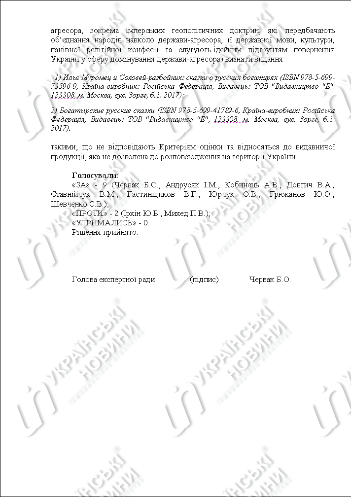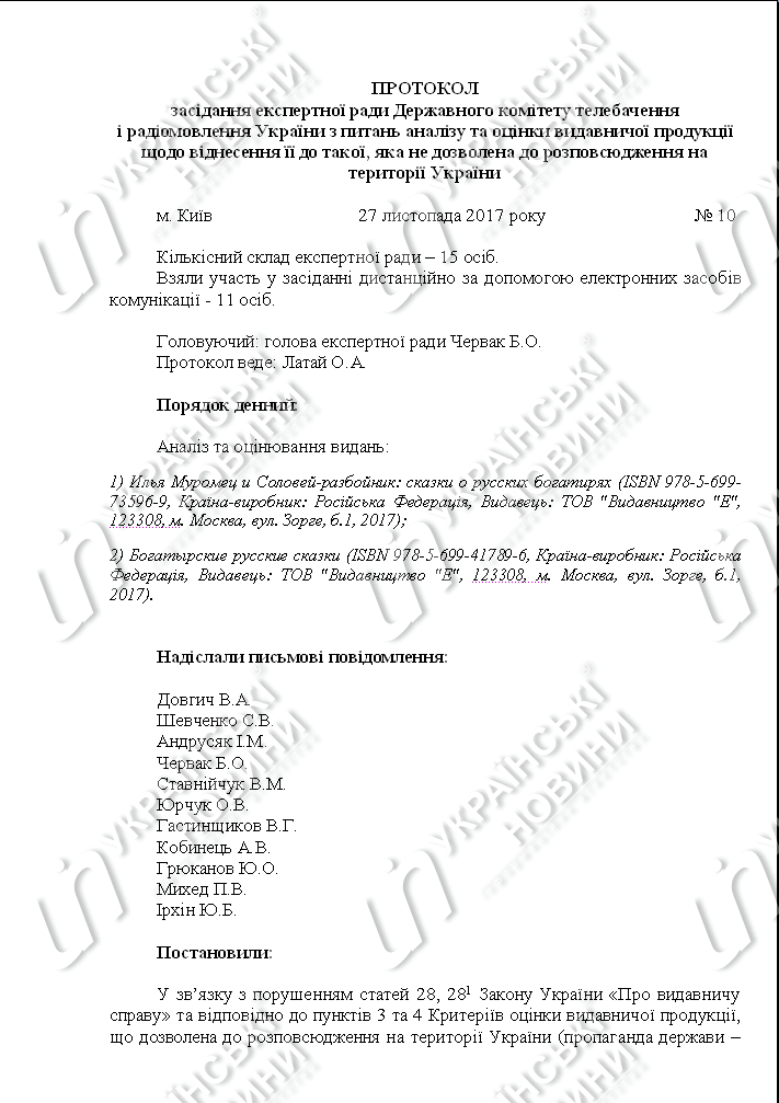 "Пропаганда государства-агрессора, в частности имперских геополитических доктрин, которые предусматривают объединение народов вокруг государства-агрессора, его государственного языка, культуры, главенствующей религиозной конфессии (православие) и служат идеологической основой возвращения Украины в сферу доминирования государства-агрессора", - поясняются в Протоколе мотивы запрета книг "Илья Муромец и Соловей-разбойник" и "Богатырские русские сказки".