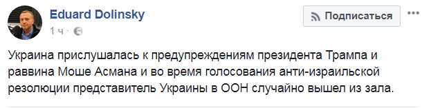 "Украина прислушалась к предупреждениям президента Трампа и раввина (главный раввин Киева и Украины от хасидов - Прим.Ред.) Моше Асмана и во время голосования анти-израильской резолюции представитель Украины в ООН случайно вышел из зала", - отметил Долинский.