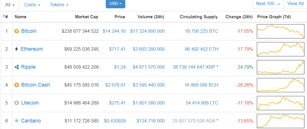 После рекорда в $20 тысяч курс биткоина подешевел уже до $14 тысяч. Только за последние сутки он потерял 17% в цене.