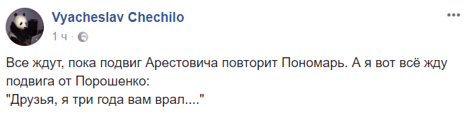 "Все ждут, пока подвиг Арестовича повторит Пономарь. А я вот всё жду подвига от Порошенко: "Друзья, я три года вам врал....", - написал Чечило.