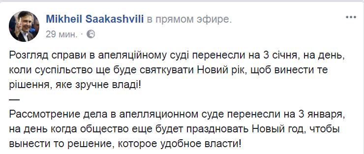 Апелляционный суд перенес рассмотрение дела Саакашвили на 3 января. Об этом сам лидер "Руха Новых сил" сообщил в Facebook.
