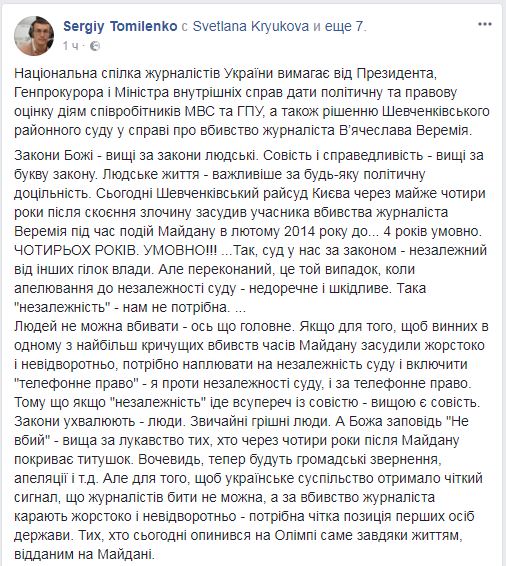 Законы Божьи - выше законы человеческие. Совесть и справедливость - высшие за букву закона. Человеческая жизнь - важнее за любую политическую целесообразность. Сегодня Шевченковский райсуд Киева спустя почти четыре года после совершения преступления приговорил участника убийства журналиста Веремия во время событий Майдана в феврале 2014 года к... 4 годам условно. Четырем годам. Условно!!! ...Да, суд у нас по закону - независимый от других ветвей власти. Но убежден, это тот случай, когда апеллирование к независимости суда - неуместно и вредно. Такая "независимость" - нам не нужна", - написал он.