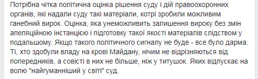 "Оценка, которая сделает невозможным оставление приговора без изменений апелляционной инстанцией и подготовку такого качества материалов следствием в дальнейшем. Если такого политического сигнала не будет - все было зря. Те, кто получили власть на крови Майдана, ничем не отличаются от предшественников, а совести у них не больше, чем у титушок. Которых отпускает на волю "самый гуманный в мире" суд", - подытожил Томиленко.