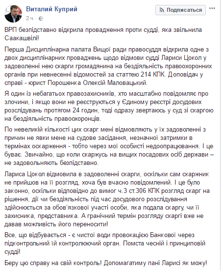 "Лариса Цокол отказала в удовлетворении жалобы, поскольку сам жалобщик не пришел на рассмотрение, хотя был вовремя уведомлен. И это было законно, поскольку в соответствии с требованиями ч.3 ст.306 УПК рассмотрение жалоб на решения, действия или бездействие в ходе досудебного расследования осуществляется при обязательном участии лица, подавшего жалобу, или его защитника, представителя. А предельный срок рассмотрения жалоб и уже не позволял его переносить", - написал Куприй.
