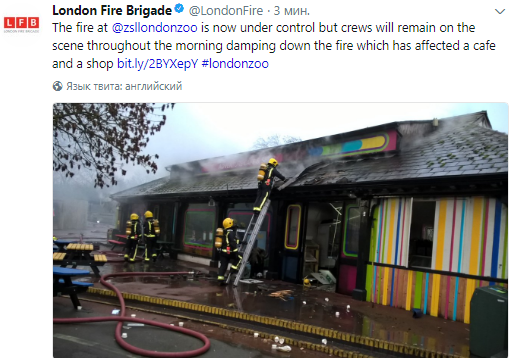"Десять пожарных машин и 72 пожарных были вызваны на тушение пожара в кафе и магазине Лондонского зоопарка. Примерно половина кафе и магазина, где также расположена зона для кормления животных, охвачены огнем", - заявил представитель пожарной бригады.