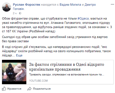 "Сегодня суд избрал этим лицам меру пресечения в виде содержания под стражей без права залога. В ходе следственных действий выяснилось, что накануне резонансных событий, "экс-айдаровцы" совершили разбойное нападение на своего бывшего собрата, также айдаровца. Именно это привело к выяснению отношений позже по ул. Атамана Головатого и стало поводом к слухам и версиям о нападении на автосалон с ограблением охранника и захватом заложников", - написал Форостяк.