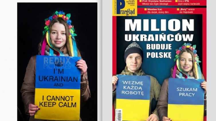 Фоторедакторы польского журнала отредактировали снимки и добавили на таблички другие надписи: "Возьмусь за любую работу" и "Ищу работу". Эти фото использовали для иллюстрации статьи "Миллион украинцев строят Польшу", в которой журналисты рассказывают о том, как граждане Украины не могут найти работу на Родине и едут в поисках заработков в Польшу.