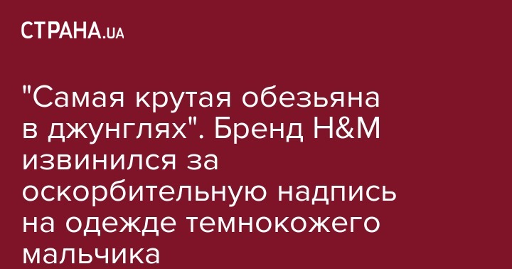Глобальный бренд одежды H&M официально извинился за рекламное фото, на котором темнокожего мальчика одели в худи с надписью "Сoolest monkey in the jungle" (Самая крутая обезьяна в джунглях – Прим.ред.).