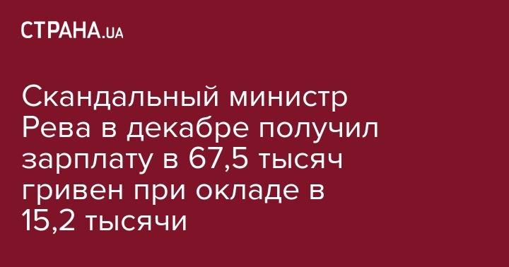 Заработная плата министра социальной политики Андрея Ревы за декабрь составила 67,5 тыс. гривны, а его заместителей - от 55,8 тыс. до 101,5 тыс. гривен, государственного секретаря министерства - 80,6 тыс. гривен.
