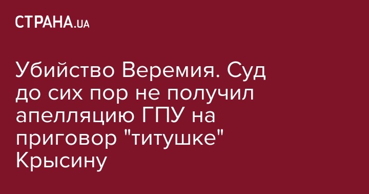 Апелляционный суд Киева до сих пор не получил апелляцию от Генпрокуратуры на приговор "титушке" Юрию Крысину, который подозревается в убийстве журналиста Вячеслава Веремия. Об этом сообщили в пресс-службе суда на запрос "Украинских новостей".