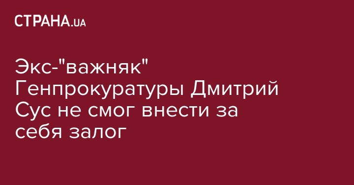 Бывший следователь Генеральной прокуратуры Украины Дмитрий Сус не смог внести за себя залог в 1 760 000 гривен. Срок для уплаты уже истек. Об этом сообщил его адвокат Дмитрий Дмитренко, передают Украинские новости.