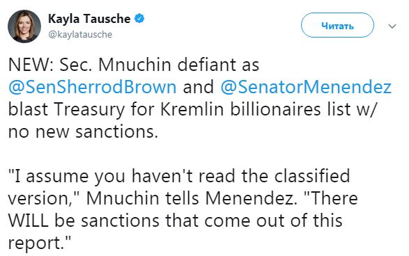 "Я предполагаю, что вы не читали секретную часть, - сказал Мнучин. - Там говорится о санкциях в связи с этим докладом", - написала в Тwitter вашингтонский корреспондент CNBC Кайла Тоше.