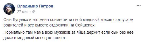 Блогер Владимир Петров насмехается над порядками в семье Луценко: "Сын Луценко и его жена совместили свой медовый месяц с отпуском родителей и все вместе отдохнули на Сейшелах. Нормально там мама всех мужиков за яйца держит, если сын без нее даже в медовый месяц не гоняет".